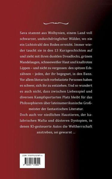Sava stammt aus Wolhynien, einem Land voll schwarzer, undurchdringlicher Wälder, wo nie ein Lichtstrahl den Boden erreicht. Immer wieder taucht sie in den 13 Kurzgeschichten auf und zieht mit ihren dunklen Dreadlocks, grünen Mandelaugen, schneeweißer Haut und knallroten Lippen - und nicht zu vergessen: den spitzen Eckzähnen - jeden, der ihr begegnet, in den Bann. Vor allem literarisch vorbelastete Personen haben es schwer, sich ihr zu entziehen. Und so wundert es auch nicht, dass zwischen Liebesspiel und diversen Kampfsportarten Platz bleibt für das Philosophieren über lateinamerikanische Großmeister der fantastischen Literatur. Doch auch vor niedlichen Haustieren, der kalabrischen Mafia und düsteren Dystopien, in denen KI-gesteuerte Autos die Weltherrschaft anstreben, sei gewarnt ...