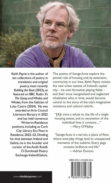 The poems of Irish poet Keith Payne's Savage Acres explore the pivotal role of housing and, by extension, community in our lives. Keith Payne revisits the new urban estates of Ireland's capital city - his own formative playing fields - and their once marginalised and neglected inhabitants who, in time, would become central to the story of the city's imaginative resistance and cultural rebirth. Keith Payne is the author of ten collections of poetry in translation and original poetry, most recently Building the Boat (2023), as featured on BBC Radio 3's The Essay, and Whales and Whales, from the Galician of Luisa Castro (2024). He was awarded an Arts Council Literature Bursary in 2022 and has held numerous Writer-in-Residence positions, including as Cork City Library Eco Poet in Residence 2022-23. Dividing his time between Ireland and Galicia, he is the founder and curator of the Aodh Ruadh Ó Domhnaill Poetry Exchange Ireland/Galicia. "[A]t once a salute to the life of a single housing estate, and an excavation of the individual lives it contains..."-Mary O'Malley "Savage Acres is a terrain, a place of flow, where everyday things lead to unexpected moments of the sublime. Every page contains brilliance and life.' -Adrian Duncan