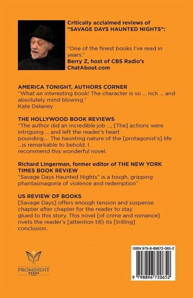 Critically acclaimed reviews of "SAVAGE DAYS HAUNTED NIGHTS": "One of the finest books I've read in years." Berry Z, host of CBS Radio's ChatAbout.com AMERICA TONIGHT, AUTHORS CORNER "What an interesting book! The character is so ... rich ... and absolutely mind blowing." Kate Delaney THE HOLLYWOOD BOOK REVIEWS "The author did an incredible job ..., [The] actions were intriguing ... and left the reader's heart pounding.... The haunting nature of the [protagonist's] life ...is remarkable to behold. I recommend this wonderful novel. Richard Lingerman, former editor of THE NEW YORK TIMES BOOK REVIEW "Savage Days Haunted Nights" is a tough, gripping phantasmagoria of violence and redemption" US REVIEW OF BOOKS [Savage Days] offers enough tension and suspense chapter after chapter for the reader to stay glued to this story. This novel [of crime and romance] rivets the reader's [attention till} its [trilling] conclusion.