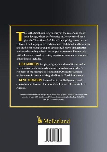This is the first book-length study of the career and life of Ann Savage, whose performance in Detour earned her a place in Time Magazine's list of the top 10 greatest movie villains. The biography covers her abused childhood and her career as a studio contract player, pin-up queen, B movie star, jetsetter and award-winning aviatrix. A complete annotated filmography with release date, credits, cast, synopsis and commentary for each of her films is included.
