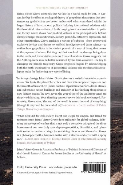 Jairus Victor Grove contends that we live in a world made by war. In Savage Ecology he offers an ecological theory of geopolitics that argues that contemporary global crises are better understood when considered within the larger history of international politics. Infusing international relations with the theoretical interventions of fields ranging from new materialism to political theory, Grove shows how political violence is the principal force behind climate change, mass extinction, slavery, genocide, extractive capitalism, and other catastrophes. Grove analyzes a variety of subjects-from improvised explosive devices and drones to artificial intelligence and brain science-to outline how geopolitics is the violent pursuit of a way of living that comes at the expense of others. Pointing out that much of the damage being done to the earth and its inhabitants stems from colonialism, Grove suggests that the Anthropocene may be better described by the term Eurocene. The key to changing the planet's trajectory, Grove proposes, begins by acknowledging both the earth-shaping force of geopolitical violence and the demands apocalypses make for fashioning new ways of living.