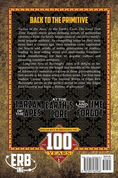 Tarzan of the Apes, At the Earth's Core, The Land That Time Forgot-three genre-defining novels of primordial adventure from the fertile imagination of one of the world's most popular authors. As compelling today as they were more than a century ago, these timeless yarns captivated the hearts and minds of entire generations of readers, leading to best-selling series and multimedia franchises while transforming the face of popular culture and spawning countless imitators.Longtime fans of Burroughs' tales of wonder will delight at the opportunity to survey the length and breadth of the Master of Adventure's immortal creations in these ground-breaking first novels in Burroughs' major series of primeval romance. For first-time readers, Savage Epics: The Seminal Works of Edgar Rice Burroughs serves as the perfect portal to enter the Edgar Rice Universe and begin a lifetime of adventure! THE FIRST UNIVERSE OF ITS KIND A century before the term "crossover" became a buzzword in popular culture, Edgar Rice Burroughs created the first expansive, fully cohesive literary universe. Coexisting in this vast cosmos was a pantheon of immortal heroes and heroines-Tarzan of the Apes, Jane Clayton, John Carter, Dejah Thoris, Carson Napier, and David Innes being only the best known among them. In Burroughs' 80-plus novels, their epic adventures transported them to the strange and exotic worlds of Barsoom, Amtor, Pellucidar, Caspak, and Va-nah, as well as the lost civilizations of Earth and even realms beyond the farthest star. Now the Edgar Rice Burroughs Universe expands both new definitive editions of Burroughs' classic works and an adventure-filled series of canonical novels written by today's talented authors! (c) Edgar Rice Burroughs, Inc. All Rights Reserved. Associated logos, characters, names, and the distinctive likenesses thereof are trademarks or registered trademarks of Edgar Rice Burroughs, Inc.