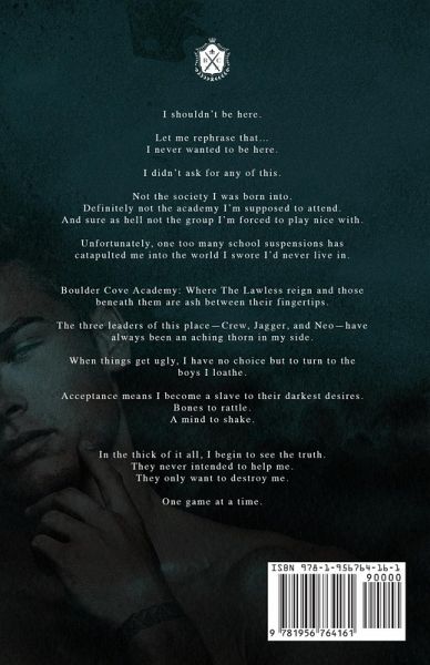 I shouldn't be here. Let me rephrase that... I never wanted to be here. I didn't ask for any of this. Not the society I was born into. Definitely not the academy I'm supposed to attend. And sure as hell not the group I'm forced to play nice with. Unfortunately, one too many school suspensions has catapulted me into the world I swore I'd never live in. Boulder Cove Academy: Where The Lawless reign and those beneath them are ash between their fingertips. The three leaders of this place-Crew, Jagger, and Neo-have always been an aching thorn in my side. When things get ugly, I have no choice but to turn to the boys I loathe. Acceptance means I become a slave to their darkest desires. Bones to rattle. A mind to shake. In the thick of it all, I begin to see the truth. They never intended to help me. They only want to destroy me. One game at a time.