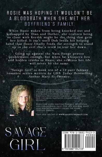 Rosie was hoping it wouldn't be a bloodbath when she met her boyfriend's family. When Rosie wakes from being knocked out and kidnapped by Dian and Dother, she realizes being so close with Kerdik might be the thing that gets her killed. It isn't until Dub lends his helping hand that Rosie finally finds the strength to stand up to the evil that's tried to tear her down. Going up against the Nain Rouge proves problematic enough, but when he whispers lies and hidden truths to Rosie, she realizes her life will never be the same. "Savage Girl" is book ten of a 14-part fantasy romance series written by USA Today Bestselling Author Mary E. Twomey.