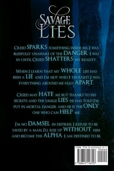 Creed sparks something inside me, I was blissfully unaware of the danger I was in until Creed shatters my reality. When I learn that my whole life has been a lie and I'm not who I thought I was everything around me falls apart. Creed may hate me but thanks to his secrets and the savage lies he has told I'm put in mortal danger and he is the only one who can help me. I'm no damsel in distress, I refuse to be saved by a man, I'll rise up without him and become the alpha I am destined to be
