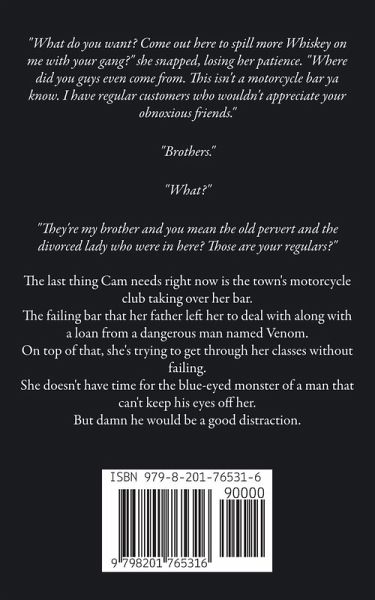 "What do you want? Come out here to spill more Whiskey on me with your gang?" she snapped, losing her patience. "Where did you guys even come from. This isn't a motorcycle bar ya know. I have regular customers who wouldn't appreciate your obnoxious friends." "Brothers." "What?" "They're my brother and you mean the old pervert and the divorced lady who were in here? Those are your regulars?" The last thing Cam needs right now is the town's motorcycle club taking over her bar. The failing bar that her father left her to deal with along with a loan from a dangerous man named Venom. On top of that, she's trying to get through her classes without failing. She doesn't have time for the blue-eyed monster of a man that can't keep his eyes off her. But damn he would be a good distraction.