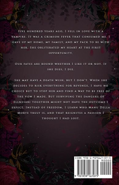 Five hundred years ago, I fell in love with a vampire. It was a crimson fever that consumed me. I gave up my home, my family, and my pack to be with her. She obliterated my heart at the first opportunity. Our fates are bound whether I like it or not. If she dies, I die. She may have a death wish, but I don't. When she decides to risk everything for revenge, I have no choice but to stop her and find a way to be free of the vow I made. But surviving the dangers of Ellnesari together might not have the outcome I expect. Instead of freedom, I learn who Manu Della Morte truly is, and that reignites a passion I thought I had lost. *This is not a standalone novel and ends on a cliffhanger.