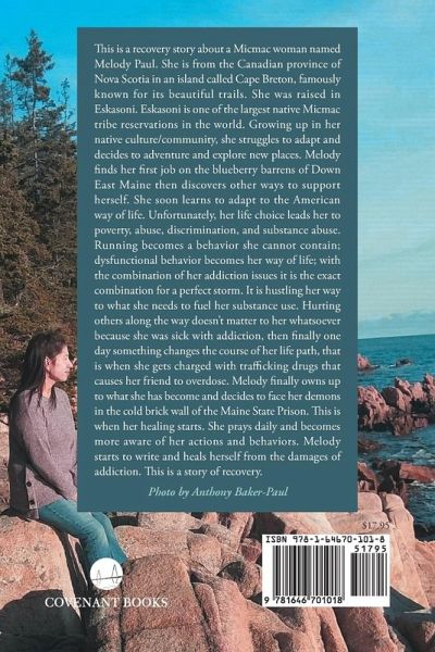 This is a recovery story about a Micmac woman named Melody Paul. She is from the Canadian province of Nova Scotia in an island called Cape Breton, famously known for its beautiful trails. She was raised in Eskasoni. Eskasoni is one of the largest native Micmac tribe reservations in the world. Growing up in her native culture/community, she struggles to adapt and decides to adventure and explore new places. Melody finds her first job on the blueberry barrens of Down East Maine then discovers other ways to support herself. She soon learns to adapt to the American way of life. Unfortunately, her life choice leads her to poverty, abuse, discrimination, and substance abuse. Running becomes a behavior she cannot contain; dysfunctional behavior becomes her way of life; with the combination of her addiction issues it is the exact combination for a perfect storm. It is hustling her way to what she needs to fuel her substance use. Hurting others along the way doesn’t matter to her whatsoever because she was sick with addiction, then finally one day something changes the course of her life path, that is when she gets charged with trafficking drugs that causes her friend to overdose. Melody finally owns up to what she has become and decides to face her demons in the cold brick wall of the Maine State Prison. This is when her healing starts. She prays daily and becomes more aware of her actions and behaviors. Melody starts to write and heals herself from the damages of addiction. This is a story of recovery.