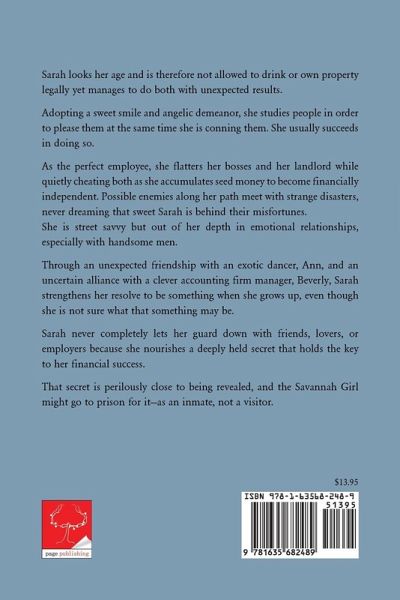 Sarah looks her age and is therefore not allowed to drink or own property legally yet manages to do both with unexpected results. Adopting a sweet smile and angelic demeanor, she studies people in order to please them at the same time she is conning them. She usually succeeds in doing so. As the perfect employee, she flatters her bosses and her landlord while quietly cheating both as she accumulates seed money to become financially independent. Possible enemies along her path meet with strange disasters, never dreaming that sweet Sarah is behind their misfortunes. She is street savvy but out of her depth in emotional relationships, especially with handsome men. Through an unexpected friendship with an exotic dancer, Ann, and an uncertain alliance with a clever accounting firm manager, Beverly, Sarah strengthens her resolve to be something when she grows up, even though she is not sure what that something may be. Sarah never completely lets her guard down with friends, lovers, or employers because she nourishes a deeply held secret that holds the key to her financial success. That secret is perilously close to being revealed, and the Savannah Girl might go to prison for it-as an inmate, not a visitor.