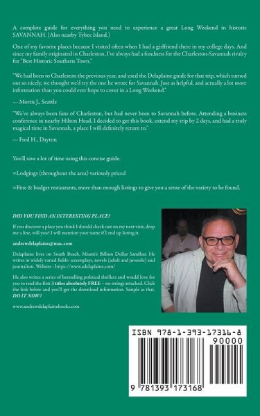 A complete guide for everything you need to experience a great Long Weekend in historic SAVANNAH. (Also nearby Tybee Island.) One of my favorite places because I visited often when I had a girlfriend there in my college days. And since my family originated in Charleston, I've always had a fondness for the Charleston-Savannah rivalry for "Best Historic Southern Town." "We had been to Charleston the previous year, and used the Delaplaine guide for that trip, which turned out so nicely, we thought we'd try the one he wrote for Savannah. Just as helpful, and actually a lot more information than you could ever hope to cover in a Long Weekend." --- Morris J., Seattle "We've always been fans of Charleston, but had never been to Savannah before. Attending a business conference in nearby Hilton Head, I decided to get this book, extend my trip by 2 days, and had a truly magical time in Savannah, a place I will definitely return to." --- Fred H., Dayton You'll save a lot of time using this concise guide. =Lodgings (throughout the area) variously priced =Fine & budget restaurants, more than enough listings to give you a sense of the variety to be found. =Principal attractions -- don't waste your precious time on the lesser ones. We've done all the work for you. =A handful of interesting shopping ideas.