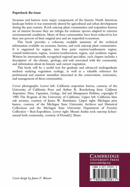 Savannas and barrens were major components of the historic North American landscape before it was extensively altered by agricultural and urban development during the past century. Rock outcrop plant communities and serpentine barrens are of interest because they are refugia for endemic species adapted to extreme environmental conditions. Many of these communities have been reduced to less than one per cent of their original area and are imperiled ecosystems. This book provides a coherent, readable summary of the technical information available on savannas, barrens and rock outcrop plant communities. It is organized by region into four parts: eastern south-eastern region, central/midwest region, western/south-western region, and northern region. Written by internationally recognized regional specialists, each chapter includes a description of the climate, geology, soils associated with the community, and information about its historic and current vegetation.