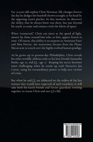 Chris Newman's life changes forever the day he dodges the baseball thrown straight at his head by the opposing team's pitcher. In that moment, he discovers the ability that he always knew was there, but just beyond his reach: to sense and connect with the fabric of space. When "connected," Chris can move at the speed of light, unseen by those around him who, to him, appear frozen in time. Of course, this ability is no surprise to Amnesius Fixer and Miss Portice, the mysterious Savants from the Planet Maran sent to watch over the highly evolved human prodigy. As he grows up in present-day Philadelphia, Chris reveals his other-worldly abilities only to his best friends Samantha Banks, age 12, and J.J., age 1. Keeping his secret becomes more challenging when he teams up with Detective Joe Carter, using his extraordinary power to help save victims of crime. But when he and J.J, are abducted on the orders of the last woman they would have expected of such treachery, it will take both his Earth friends and Savant guardians working together to rescue Chris and save J.J's life.