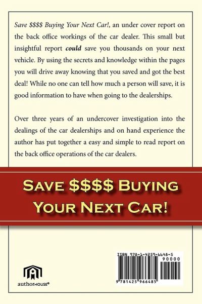 Save $$$$ Buying Your Next Car!, an under cover report on the back office workings of the car dealer. This small but insightful report could save you thousands on your next vehicle. By using the secrets and knowledge within the pages you will drive away knowing that you saved and got the best deal! While no one can tell how much a person will save, it is good information to have when going to the dealerships. Over three years of an undercover investigation into the dealings of the car dealerships and on hand experience the author has put together a easy and simple to read report on the back office operations of the car dealers.