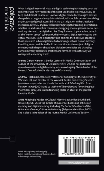 '...an excellent overview of current discourse surrounding how we store, hold and deal with memories as a concept or product, when they are primarily created and/or experienced in digital form. I would strongly recommend this book to anyone entering or currently working within the areas of digital death or digital identity and heritage. The book creates an intriguing line of enquiry and draws the reader into a range of arguments, bipolarities, expanded examples, studies and sites, which are brought together in a coherent manner under the general theme of how new memory structures are augmenting human practices, cultures and even, to an extent, the idea of the human itself in a post-digital age. This book provides a contemporary analysis of the field of memory studies, which draws from the past and looks to the future.' - Stacey Pitsillides, Goldsmiths, University of London, International Journal of Performance, Arts and Digital Media