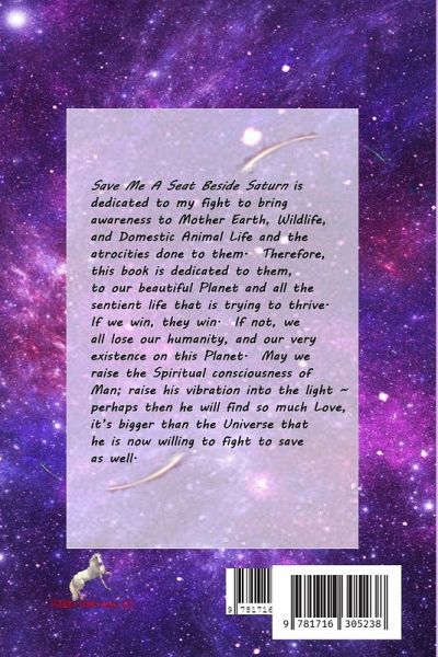 Save Me A Seat Beside Saturn is dedicated to my fight to bring awareness to Mother Earth, Wildlife, and Domestic Animal Life and the atrocities done to them. Therefore, this book is dedicated to them, to our beautiful Planet and all the sentient life that is trying to thrive. If we win, they win. If not, we all lose our humanity, and our existence on this Planet. May we raise the Spiritual consciousness of Man; raise his vibration into the light ~ perhaps then he will find so much Love, it's bigger than the Universe that he is now willing to fight to save as well.