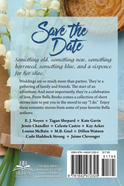 Something old, something new, something borrowed, something blue, and a sixpence for her shoe. A woman realizes she was meant to decline a wedding invitation, but only after she's arrived. Can she borrow some of a stranger's charm to make it through an awkward night? A power outage during a rehearsal dinner. A vanishing bride. A distraught groom. How's an innkeeper to keep up? Especially when the bride reappears with a strange request: help her escape her own wedding. It's awfully easy to bring "something old" to your wedding when one of the brides happens to be Death's 700 year-old Head Minion. As if a museum wasn't enough of a draw for a history nerd, throw in holograms, a secret wedding, and a mysteriously well-informed woman and things really get interesting. Weddings are so much more than parties. They're a gathering of family and friends. The start of an adventure. And most importantly, they're a celebration of love. From Bella Books comes a collection of short stories sure to put you in the mood to say "I do." Enjoy these romantic stories from the following Bella authors: Tagan Shepard Jessie Chandler Louise McBain M.B. Guel E. J. Noyes Celeste Castro Kay Acker Dillon Watson Cade Haddock Strong Kate Gavin Jaime Clevenger