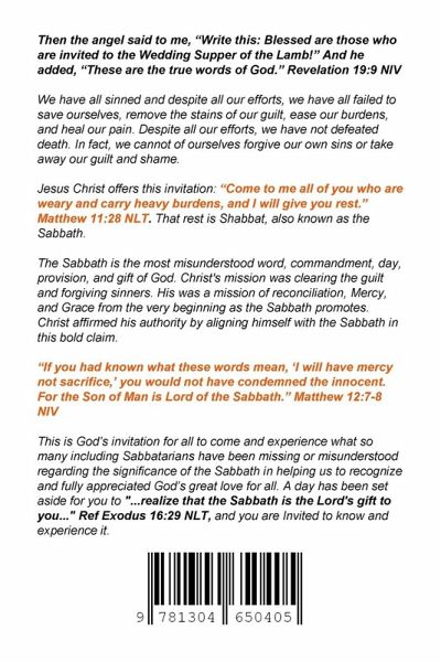 Then the angel said to me, "Write this: Blessed are those who are invited to the Wedding Supper of the Lamb!" And he added, "These are the true words of God." Revelation 19:9 NIV We have all sinned and despite all our efforts, we have all failed to save ourselves, remove the stains of our guilt, ease our burdens, and heal our pain. Despite all our efforts, we have not defeated death. In fact, we cannot of ourselves forgive our own sins or take away our guilt and shame. Jesus Christ offers this invitation: "Come to me all of you who are weary and carry heavy burdens, and I will give you rest." Matthew 11:28 NLT. That rest is Shabbat, also known as the Sabbath. The Sabbath is the most misunderstood word, commandment, day, provision, and gift of God. Christ's mission was clearing the guilt and forgiving sinners. His was a mission of reconciliation, Mercy, and Grace from the very beginning as the Sabbath promotes. Christ affirmed his authority by aligning himself with the Sabbath in this bold claim. "If you had known what these words mean, 'I will have mercy not sacrifice,' you would not have condemned the innocent. For the Son of Man is Lord of the Sabbath." Matthew 12:7-8 NIV This is God's invitation for all to come and experience what so many including Sabbatarians have been missing or misunderstood regarding the significance of the Sabbath in helping us to recognize and fully appreciated God's great love for all. A day has been set aside for you to "...realize that the Sabbath is the Lord's gift to you, and you are Invited to know and experience it.