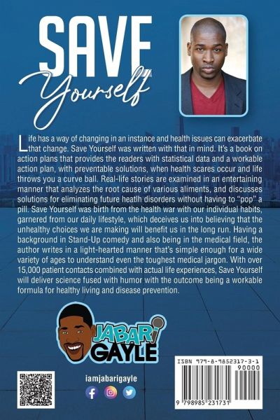 Life has a way of changing in an instance and health issues can exacerbate that change. Save Yourself was written with that in mind. This is a book will provide the readers with statistical data, workable healthy action plans, and preventable solutions; when health scares occur, and life throws you a curveball. Real-life stories are examined in an entertaining manner that analyzes the root cause of various ailments and discusses solutions for eliminating future health disorders without having to "pop" a pill. Save Yourself was birthed from the health war within our individual habits, garnered from our daily lifestyle, which deceives us into believing that the unhealthy choices we are making will benefit us in the long run. Save Yourself will deliver science fused with humor. The outcome is expected to be a workable formula for healthy living and disease prevention.