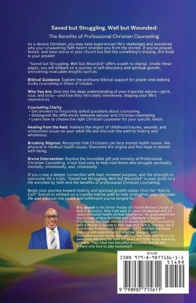 As a devout Christian, you may have experienced life's challenges and wondered why your unwavering faith hasn't shielded you from the storms. If you've prayed, fasted, and been active in your church but feel like something's missing, this book is your answer! "Saved but Struggling, Well but Wounded" offers a path to change. Inside these pages, you will embark on a journey of self-discovery and spiritual growth, uncovering invaluable insights such as: Biblical Guidance: Explore the profound biblical support for prayer and seeking Godly counseling in times of trouble. Who You Are: Dive into the deep understanding of your tripartite nature-spirit, soul, and body-and how they intricately interweave, shaping your life's experiences. Counseling Clarity: * Get answers to frequently asked questions about counseling. * Distinguish the differences between secular and Christian counseling. * Learn how to choose the right Christian counselor for your specific needs. Healing from the Past: Address the impact of childhood trauma, wounds, and unresolved issues on your adult life and discover the path to healing and wholeness. Breaking Stigmas: Recognize that Christians can face mental health issues, like physical or medical health issues. Overcome the stigma and find hope in mental well-being. Divine Intervention: Explore the incredible gift and ministry of Professional Christian Counseling, a tool God uses to help heal those who struggle spiritually, mentally, emotionally, and, relationally. If you crave a deeper connection with God, renewed purpose, and the strength to overcome life's trials, "Saved but Struggling, Well but Wounded" is your guide to a life enriched by faith and the benefits of professional Christian counseling.