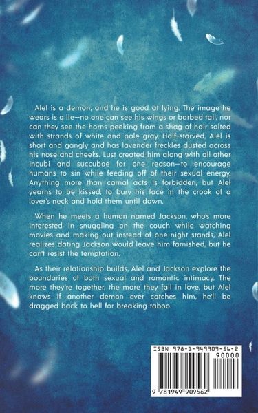 Alel is a demon, and he is good at lying. The image he wears is a lie-no one can see his wings or barbed tail, nor can they see the horns peeking from a shag of hair salted with strands of white and pale gray. Half-starved, Alel is short and gangly and has lavender freckles dusted across his nose and cheeks. Lust created him along with all other incubi and succubae for one reason-to encourage humans to sin while feeding off of their sexual energy. Anything more than carnal acts is forbidden, but Alel yearns to be kissed, to bury his face in the crook of a lover's neck and hold them until dawn. When he meets a human named Jackson, who's more interested in snuggling on the couch while watching movies and making out instead of one-night stands, Alel realizes dating Jackson would leave him famished, but he can't resist the temptation. As their relationship builds, Alel and Jackson explore the boundaries of both sexual and romantic intimacy. The more they're together, the more they fall in love, but Alel knows if another demon ever catches him, he'll be dragged back to hell for breaking taboo.