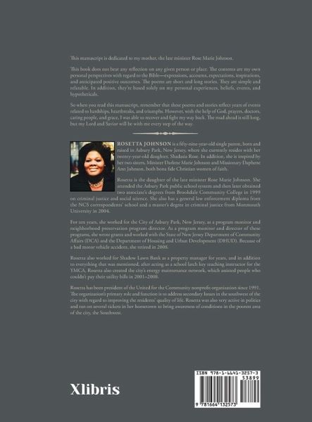 This manuscript is dedicated to my mother, the late minister Rose Marie Johnson. This book does not bear any reflection on any given person or place. The contents are my own personal perspectives with regard to the Bible-expressions, accounts, expectations, inspirations, and anticipated positive outcomes. The poems are short and long stories. They are simple and relatable. In addition, they're based solely on my personal experiences, beliefs, events, and hypotheticals. So when you read this manuscript, remember that these poems and stories reflect years of events related to hardships, heartbreaks, and triumphs. However, with the help of God, prayers, doctors, caring people, and grace, I was able to recover and fight my way back. The road ahead is still long, but my Lord and Savior will be with me every step of the way.