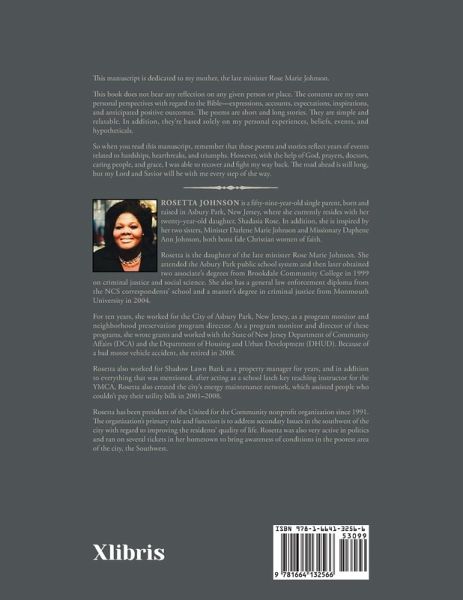 This manuscript is dedicated to my mother, the late minister Rose Marie Johnson. This book does not bear any reflection on any given person or place. The contents are my own personal perspectives with regard to the Bible-expressions, accounts, expectations, inspirations, and anticipated positive outcomes. The poems are short and long stories. They are simple and relatable. In addition, they're based solely on my personal experiences, beliefs, events, and hypotheticals. So when you read this manuscript, remember that these poems and stories reflect years of events related to hardships, heartbreaks, and triumphs. However, with the help of God, prayers, doctors, caring people, and grace, I was able to recover and fight my way back. The road ahead is still long, but my Lord and Savior will be with me every step of the way.