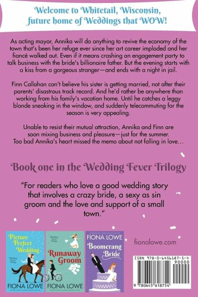 Welcome to Whitetail, Wisconsin, future home of Weddings that WOW! How far would you go to save your town? As acting mayor, Annika will do anything to revive the economy of the town that's been her refuge ever since her art career imploded and her fiancé walked out. Even if it means crashing an engagement party to talk business with the bride's billionaire father. But the evening starts with a kiss from a gorgeous stranger-and ends with a night in jail. Finn Callahan can't believe his sister is getting married, not after their parents' disastrous track record. And he'd rather be anywhere than working from his family's vacation home. Until he catches a leggy blonde sneaking in the window. Suddenly telecommuting for the season is very appealing. Unable to resist their mutual attraction, Annika and Finn are soon mixing business and pleasure-just for the summer. Too bad Annika's heart missed the memo about not falling in love... A fun romantic romp in a quirky small town. Book 1 in the Wedding Fever Trilogy For more weddings in Whitetail, check out Picture Perfect Wedding and Runaway Groom.