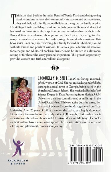 This is the sixth book in the series. Ben and Wanda Davis and their growing family continue to serve their community. As parents and entrepreneurs, they seek help with family responsibilities, as they grow the family empire. His siblings, David and Mary, continue on their quest to discover all that God has saved for them. As in life, surprises continue to surface that test their faith. Ben and Wanda are adamant about protecting their legacy. They recognize that many personal sacrifices must be made during life and death situations. This book series is not only heartwarming, but family focused. It is biblically sound with life lessons and pearls of wisdom. It is also a great educational resource for teenagers and adults. All books in this series can be utilized in a classroom setting or for those who enjoy personal inspiration. This growth opportunity provides wisdom and faith and will not disappoint.