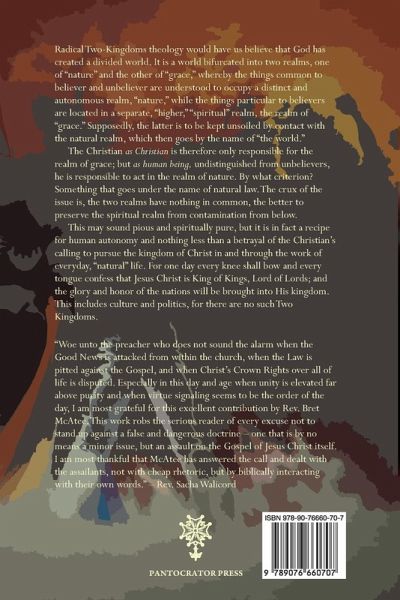 Radical Two-Kingdom theology would have us believe that God has created a divided world. This world is bifurcated into two realms, one of "nature" and the other of "grace," whereby the things common to believer and unbeliever are understood to occupy a distinct and autonomous realm, "nature," while the things particular to believers are located in a separate, "higher," "spiritual" realm, the realm of "grace." Supposedly, the latter is to be kept unsoiled by contact with the natural realm, which then goes by the name of "the world." The Christian as Christian is therefore only responsible for the realm of grace; but as human being, undistinguished from unbelievers, he is responsible to act in the realm of nature. By what criterion? Something that goes under the name of natural law. The crux of the issue is, the two realms have nothing in common, the better to preserve the spiritual realm from contamination from below. This may sound pious and spiritually pure, but it is in fact a recipe for human autonomy and nothing less than a betrayal of the Christian's calling to pursue the kingdom of Christ in and through the work of everyday, "natural" life. For one day every knee shall bow and every tongue confess that Jesus Christ is King of Kings, Lord of Lords; and the glory and honor of the nations will be brought into His kingdom. This includes culture and politics, for there are no such Two Kingdoms. "Woe unto the preacher who does not sound the alarm when the Good News is attacked from within the church, when the Law is pitted against the Gospel, and when Christ's Crown Rights over all of life is disputed. Especially in this day and age when unity is elevated far above purity and when virtue signaling seems to be the order of the day, I am most grateful for this excellent contribution by Rev. Bret McAtee. This work robs the serious reader of every excuse not to stand up against a false and dangerous doctrine - one that is by no means a minor issue, but an assault on the Gospel of Jesus Christ itself. I am most thankful that McAtee has answered the call and dealt with the assailants, not with cheap rhetoric, but by biblically interacting with their own words."Rev. Sacha Walicord
