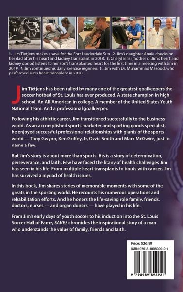 Jim Tietjens has been called by many one of the greatest goalkeepers the soccer hotbed of St. Louis has ever produced. A state champion in high school. An All-American in college. A member of the United States Youth National Team. And a professional goalkeeper. Following his athletic career, Jim transitioned successfully to the business world. As an accomplished sports marketer and sporting goods specialist, he enjoyed successful professional relationships with giants of the sports world - Tony Gwynn, Ken Griffey, Jr, Ozzie Smith and Mark McGwire, just to name a few. But Jim's story is about more than sports. His is a story of determination, perseverance, and faith. Few have faced the litany of health challenges Jim has seen in his life. From multiple heart transplants to bouts with cancer, Jim has survived a myriad of health issues. In this book, Jim shares stories of memorable moments with some of the greats in the sporting world. He recounts his numerous operations and rehabilitation efforts. And he honors the life-saving role family, friends, doctors, nurses - and organ donors - have played in his life. From Jim's early days of youth soccer to his induction into the St. Louis Soccer Hall of Fame, Saves chronicles the inspirational story of a man who understands the value of family, friends and faith.