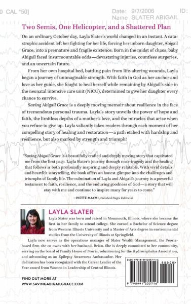 Two Semis, One Helicopter, and a Shattered PlanOn an ordinary October day, Layla Slater's world changed in an instant. A catastrophic accident left her fighting for her life, forcing her unborn daughter, Abigail Grace, into a premature and fragile existence. Born in the midst of chaos, baby Abigail faced insurmountable odds-devastating injuries, countless surgeries, and an uncertain future.From her own hospital bed, battling pain from life-altering wounds, Layla began a journey of unimaginable strength. With faith in God as her anchor and love as her guide, she fought to heal herself while remaining by Abigail's side in the neonatal intensive care unit (NICU), determined to give her daughter every chance to survive.Saving Abigail Grace is a deeply moving memoir about resilience in the face of tremendous personal trauma. Layla's story unveils the power of hope and faith, the limitless depths of a mother's love, and the miracles that arise when you refuse to give up. Layla valiantly takes readers through each moment of her compelling story of healing and restoration-a path etched with hardship and resilience, but also marked by strength and triumph!