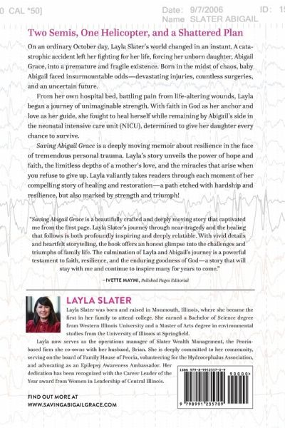 Two Semis, One Helicopter, and a Shattered PlanOn an ordinary October day, Layla Slater's world changed in an instant. A catastrophic accident left her fighting for her life, forcing her unborn daughter, Abigail Grace, into a premature and fragile existence. Born in the midst of chaos, baby Abigail faced insurmountable odds-devastating injuries, countless surgeries, and an uncertain future.From her own hospital bed, battling pain from life-altering wounds, Layla began a journey of unimaginable strength. With faith in God as her anchor and love as her guide, she fought to heal herself while remaining by Abigail's side in the neonatal intensive care unit (NICU), determined to give her daughter every chance to survive.Saving Abigail Grace is a deeply moving memoir about resilience in the face of tremendous personal trauma. Layla's story unveils the power of hope and faith, the limitless depths of a mother's love, and the miracles that arise when you refuse to give up. Layla valiantly takes readers through each moment of her compelling story of healing and restoration-a path etched with hardship and resilience, but also marked by strength and triumph!