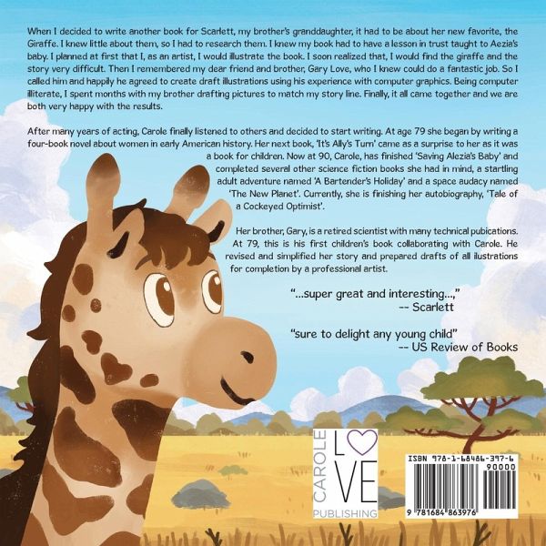 When I decided to write another book for Scarlett, my brother's granddaughter, it had to be about her new favorite, the Giraffe. I knew little about them, so I had to research them. I knew my book had to have a lesson in trust taught to Aezia's baby. I planned at first that I, as an artist, I would illustrate the book. I soon realized that, I would find the giraffe and the story very difficult. Then I remembered my dear friend and brother, Gary Love, who I knew could do a fantastic job. So I called him and happily he agreed to create draft illustrations using his experience with computer graphics. Being computer illiterate, I spent months with my brother drafting pictures to match my story line. Finally, it all came together and we are both very happy with the results. After many years of acting, Carole finally listened to others and decided to start writing. At age 79 she began by writing a four-book novel about women in early American history. Her next book, 'It's Ally's Turn' came as a surprise to her as it was a book for children. Now at 90, Carole, has finished 'Saving Alezia's Baby' and completed several other science fiction books she had in mind, a startling adult adventure named 'A Bartender's Holiday' and a space audacy named 'The New Planet'. Currently, she is finishing her autobiography, 'Tale of a Cockeyed Optimist'. Her brother, Gary, is a retired scientist with many technical pubications. At 79, this is his first children's book collaborating with Carole. He revised and simplified her story and prepared drafts of all ilustrations for completion by a professional artist.