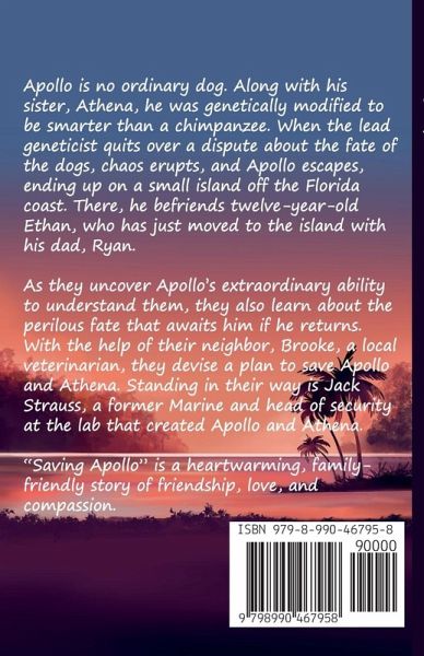 Apollo is no ordinary dog. Along with his sister, Athena, he was genetically modified to be smarter than a chimpanzee. When the lead geneticist quits over a dispute about the fate of the dogs, chaos erupts, and Apollo escapes, ending up on a small island off the Florida coast. There, he befriends twelve-year-old Ethan, who has just moved to the island with his dad, Ryan. As they uncover Apollo's extraordinary ability to understand them, they also learn about the perilous fate that awaits him if he returns. With the help of their neighbor, Brooke, a local veterinarian, they devise a plan to save Apollo and Athena. Standing in their way is Jack Strauss, a former Marine and head of security at the lab that created Apollo and Athena. "Saving Apollo" is a heartwarming, family-friendly story of friendship, love, and compassion.