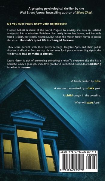 A gripping psychological thriller by the Wall Street Journal bestselling author of Silent Child. Do you ever really know your neighbours? Hannah Abbott is afraid of the world. Plagued by anxiety, she lives an isolated, uneventful life in suburban Yorkshire. She rarely leaves her house, and her only friend is Edith, her elderly neighbour. But when the Mason family moves in across the street, Hannah's quiet life is changed forever. They seem perfect, with their pretty teenage daughter, April, and their public displays of affection. But one day, Hannah sees April place an unsettling sign in the window, and has to make a choice. Laura Mason is sick of pretending everything is okay. To everyone else she has a beautiful family, a good job, and a loving husband. But behind closed doors, nothing is what it seems. A family broken by lies. A woman traumatized by a dark past. A child caught in the crossfire. Who will save April? What readers are saying about Saving April: "I couldn't stop reading until I reached the end." "I loved this book, couldn't put it down. Great story, great characters, and loved the writing style." "What a page turner. Just loved it read it in a day." "I couldn't put it down. I read it in one evening! The end was a real surprise."