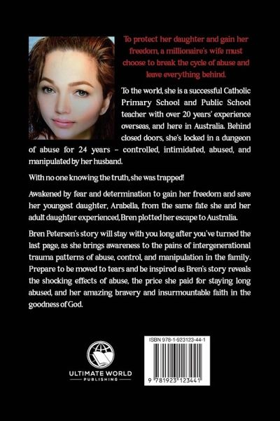To protect her daughter and gain her freedom, a millionaire's wife must choose to break the cycle of abuse and leave everything behind.To the world, she is a successful Catholic Primary School and Public School teacher with over 20 years' experience overseas, and here in Australia. Behind closed doors, she's locked in a dungeon of abuse for 24 years - controlled, intimidated, abused, and manipulated by her husband.With no one knowing the truth, she was trapped! Awakened by fear and determination to gain her freedom and save her youngest daughter, Arabella, from the same fate she and her adult daughter experienced, Bren plotted her escape to Australia.Bren Petersen's story will stay with you long after you've turned the last page, as she brings awareness to the pains of intergenerational trauma patterns of abuse, control, and manipulation in the family. Prepare to be moved to tears and be inspired as Bren's story reveals the shocking effects of abuse, the price she paid for staying long abused, and her amazing bravery and insurmountable faith in the goodness of God.