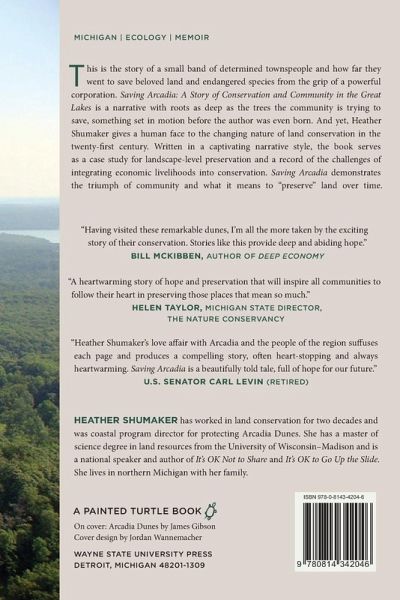 Saving Arcadia: A Story of Conservation and Community in the Great Lakes is a suspenseful and intimate land conservation adventure story set in the Great Lakes heartland. The story spans more than forty years, following the fate of a magnificent sand dune on Lake Michigan and the people who care about it. Author and narrator Heather Shumaker shares the remarkable untold stories behind protecting land and creating new nature preserves. Written in a compelling narrative style, the book is intended in part as a case study for landscape-level conservation and documents the challenges of integrating economic livelihoods into conservation and what it really means to "preserve" land over time. This is the story of a small band of determined townspeople and how far they went to save beloved land and endangered species from the grip of a powerful corporation. Saving Arcadia is a narrative with roots as deep as the trees the community is trying to save, something set in motion before the author was even born. And yet, Shumaker gives a human face to the changing nature of land conservation in the twenty-first century. Throughout this chronicle we meet people like Elaine, a nineteen-year-old farm wife; Dori, a lakeside innkeeper; and Glen, the director of the local land trust. Together with hundreds of others they cross cultural barriers and learn to help one another in an effort to win back the six-thousand-acre landscape taken over by Consumers Power that is now facing grave devastation. The result is a triumph of community that includes working farms, local businesses, summer visitors, year-round residents, and a network of land stewards. A work of creative nonfiction, Saving Arcadia is the adventurous tale of everyday people fighting to reclaim the land that has been in their family for generations. It explores ideas about nature and community, and anyone from scholars of ecology and conservation biology to readers of naturalist writing can gain from Arcadia's story.