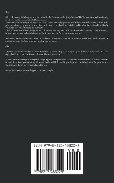 Blu All I really wanna do is keep my head down and be the Enforcer for the Kings Reapers MC. The downside is they're heavily involved with the mafia, and fuck, I hate the mafia. Vinn Romano is an arrogant ass but it's his sister, Gianna, that really grates on me. Walking around like some entitled mafia princess and expecting men to fall at her feet just because of her bloodline. Fuck that, and fuck her if she thinks I'll be like the other men she's pushed around her entire life. I ain't like most men. I don't play games, and I don't want anything to do with the damn mafia. But things change when faces from the past turn up and start bringing my family into wars they've got no business starting. Now I'm forced to turn to a man I haven't needed since I was eighteen years old and make sacrifices to save her, because despite pushing her away, Gia has weaved her way deep into my heart. Gia I don't know what I ever did to upset Blu. Since the day he turned up at the Kings Reapers' clubhouse, he was rude. All I ever try to do is be nice, but it makes no difference. The man loathes me. When a series of events push us together, things begin to change between us. Maybe he realises I'm not the princess he seems to think I am. Don't get me wrong, I love my family and I'll do anything to help them, including marry the great Ricardo Donini, but it doesn't hurt to get to know Blu too. It's not like anything will ever happen between us . . . right?