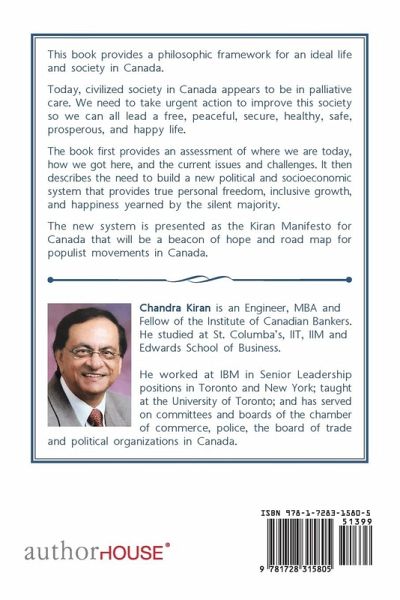 This book provides a philosophic framework for an ideal life and society in Canada. Today, civilized society in Canada appears to be in palliative care. We need to take urgent action to improve this society so we can all lead a free, peaceful, secure, healthy, safe, prosperous, and happy life. The book first provides an assessment of where we are today, how we got here, and the current issues and challenges. It then describes the need to build a new political and socioeconomic system that provides true personal freedom, inclusive growth, and happiness yearned by the silent majority. The new system is presented as the Kiran Manifesto for Canada that will be a beacon of hope and road map for populist movements in Canada.