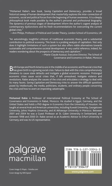 "Mohamed Rabie's new book, Saving Capitalism and Democracy, provides a broad historical sweep of human development that masterfully explores the inter-connection of economic, social and political forces from the beginning of human awareness. It is a deeply philosophical book made possible by the author's personal and professional biography. The dynamics of previous stages of development inform the author's cogent analysis of contemporary dysfunctions and his fresh recommendations for overcoming the current global crisis." - Ann Philips, Public Policy Scholar, Woodrow Wilson International Center for Scholars, USA