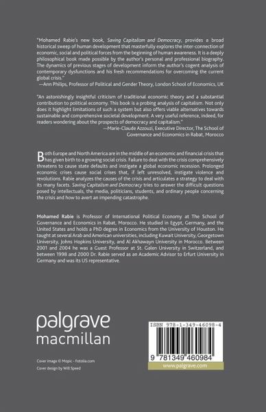 "Mohamed Rabie's new book, Saving Capitalism and Democracy, provides a broad historical sweep of human development that masterfully explores the inter-connection of economic, social and political forces from the beginning of human awareness. It is a deeply philosophical book made possible by the author's personal and professional biography. The dynamics of previous stages of development inform the author's cogent analysis of contemporary dysfunctions and his fresh recommendations for overcoming the current global crisis." - Ann Philips, Public Policy Scholar, Woodrow Wilson International Center for Scholars, USA