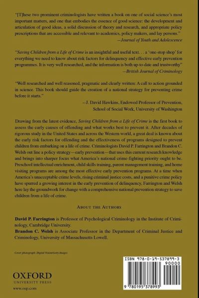 After decades of rigorous study in the United States and across the Western world, a great deal is known about the early risk factors for offending. High impulsiveness, low attainment, criminal parents, parental conflict, and growing up in a deprived, high-crime neighborhood are among the most important factors. There is also a growing body of high quality scientific evidence on the effectiveness of early prevention programs designed to prevent children from embarking on a life of crime. Drawing on the latest evidence, Saving Children from a Life of Crime is the first book to assess the early causes of offending and what works best to prevent it. Preschool intellectual enrichment, child skills training, parent management training, and home visiting programs are among the most effective early prevention programs. Criminologists David Farrington and Brandon Welsh also outline a policy strategy - early prevention - that uses this current research knowledge and brings into sharper focus what America's national crime fighting priority ought to be.At a time when unacceptable crime levels in America, rising criminal justice costs, and a punitive crime policy have spurred a growing interest in the early prevention of delinquency, Farrington and Welsh here lay the groundwork for change with a comprehensive national prevention strategy to save children from a life of crime.