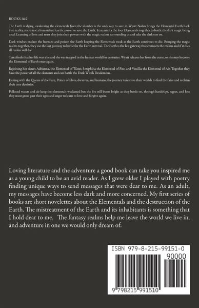 BOOKS 1&2 The Earth is dying, awakening the elementals from the slumber is the only way to save it. Wyatt Nolan brings the Elemental Earth back into reality, she is not a human but has the power to save the Earth. Terra unites the four Elementals together to battle the dark magic. Dark witches enslave the humans and poison the Earth keeping the Elementals weak as the Earth continues to die. Bringing the magic realms together, they use the last gateway to battle for the Earth survival. The Earth is the gateway that connects the realms and if it dies all will die. Terra finds that her life was a lie and she was trapped in the human world for centuries. Wyatt releases her from the curse, so she may become the Elemental of Earth once again. Terra rejoins her sisters Adrianna, the Elemental of Water, Seraphina the Elemental of Fire, and Venillia the Elemental of Air. Together they have the power of all the elements and can battle the Dark Witch Desdemona. Joining with the Queen of the Faye, Prince of Elves, dwarves, and humans, the journey takes you their worlds to find the fates and reclaim their true destinies. Polluted waters and air keep the elementals weakened, but the fire still burns bright as they battle on, through hardships, regret, and loss they must grow past their egos and anger to learn to love and forgive again.