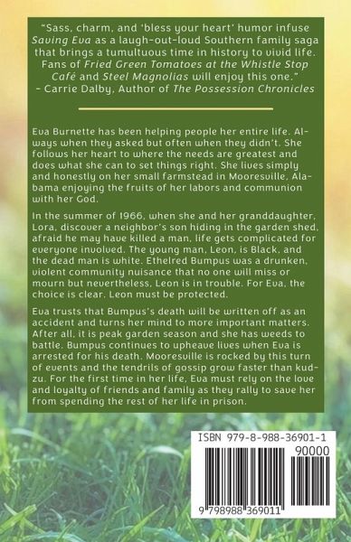 Eva Burnette has been helping people her entire life. Always when they asked but often when they didn't. She follows her heart to where the needs are greatest and does what she can to set things right. She lives simply and honestly on her small farmstead in Mooresville, Alabama enjoying the fruits of her labors and communion with her God. In the summer of 1966, when she and her granddaughter, Lora, discover a neighbor's son hiding in the garden shed, afraid he may have killed a man, life gets complicated for everyone involved. The young man, Leon, is black and the dead man is white. Ethelred Bumpus was a drunken, violent, community nuisance that no one will miss or mourn but nevertheless, Leon is in trouble. For Eva, the choice is clear. Leon must be protected. Eva trusts that Bumpus's death will be written off as an accident and turns her mind to more important matters. After all, it is peak garden season and she has weeds to battle. Bumpus continues to upheave lives when Eva is arrested for his death. The community of Mooresville is rocked by this turn of events and the tendrils of gossip grow faster than kudzu. For the first time in her life, Eva must rely on the love and loyalty of friends and family as they rally to save her from spending the rest of her life in prison.