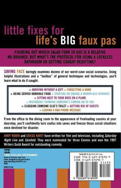 Little fixes for life's BIG faux pas Figuring out which salad fork to use is a relative no-brainer, but what's the protocol for using a lockless bathroom or getting caught regifting? Saving Face daringly examines dozens of our worst-case social scenarios. Using helpful illustrations and a "toolbox" of general techniques and technologies, you'll learn what to do if caught: * Arriving without a gift * Forgetting a name * Being served horrible food * Starting or ending a workplace romance * Sitting next to your boss on a plane * Mistakenly thinking someone's coming on to you * Clogging someone else's toilet * Getting rid of guests * Leaving a bad phone message From the office to the dining room to the appearance of freeloading cousins at your doorstep, you'll confidently turn snafus into saves and finesse those social situations once destined for disaster.