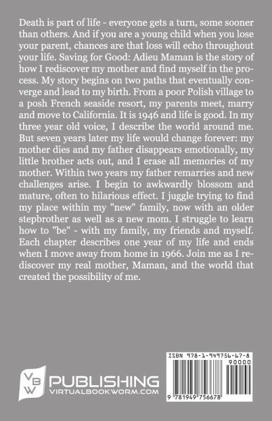 Death is part of life - everyone gets a turn, some sooner than others. And if you are a young child when you lose your parent, chances are that loss will echo throughout your life. Saving for Good: Adieu Maman is the story of how I rediscover my mother and find myself in the process. My story begins on two paths that eventually converge and lead to my birth. From a poor Polish village to a posh French seaside resort, my parents meet, marry and move to California. It is 1946 and life is good. In my three year old voice, I describe the world around me. But seven years later my life would change forever: my mother dies and my father disappears emotionally, my little brother acts out, and I erase all memories of my mother. Within two years my father remarries and new challenges arise. I begin to awkwardly blossom and mature, often to hilarious effect. I juggle trying to find my place within my "new" family, now with an older stepbrother as well as a new mom. I struggle to learn how to "be" - with my family, my friends and myself. Each chapter describes one year of my life and ends when I move away from home in 1966. Join me as I rediscover my real mother, Maman, and world that created the possibility of me.