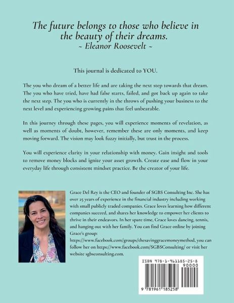 The future belongs to those who believe in the beauty of their dreams. ~ Eleanor Roosevelt ~ ¿This journal is dedicated to YOU. The you who dream of a better life and are taking the next step towards that dream. The you who have tried, have had false starts, failed, and got back up again to take the next step. The you who is currently in the throws of pushing your business to the next level and experiencing growing pains that feel unbearable. In this journey through these pages, you will experience moments of revelation, as well as moments of doubt, however, remember these are only moments, and keep moving forward. The vision may look fuzzy initially, but trust in the process. You will experience clarity in your relationship with money. Gain insight and tools to remove money blocks and ignite your asset growth. Create ease and flow in your everyday life through consistent mindset practice. Be the creator of your life.