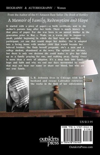 It started with a piece of paper--a birth certificate, sent to the author's parents long after her birth. There is much history in that piece of paper. For she was born to an unwed mother in the generation prior to Roe v. Wade, on a warm day in August-a small, painful beginning in which she had been an unwilling participant, yet one that would shape her destiny. She is adopted into a loving home with another child that would become her beloved brother. She finds herself pregnant; she's a teen and a college student, abandoned at the news. The options are obvious, but there is only one decision she could make: to give her child up to a family praying for one, and walking away. Saving Grace is more than a story of adoption. It's a deep look into family-at hope and faith and why we end our days surrounded by souls that may not bear our name or share our blood, but who are our true family.