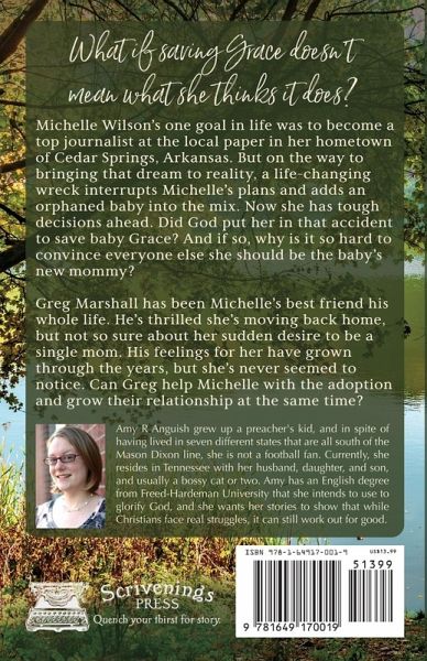 Michelle Wilson's one goal in life was to become a top journalist at the local paper back in her hometown of Cedar Springs, AR. But on the way to bringing that dream to reality, a life-changing wreck interrupts Michelle's plans and adds an orphaned baby into the mix. Now, she has tough decisions ahead-did God put her in that accident to save baby Grace? And if so, why is it so hard to convince everyone else she should be the baby's new mommy? Greg Marshall has been Michelle's best friend his whole life. He's thrilled she's moving back home, but not so sure about her sudden desire to be a single mom. His feelings for her have grown through the years, but she's never seemed to notice. Can he help Michelle with the adoption and grow their relationship at the same time?