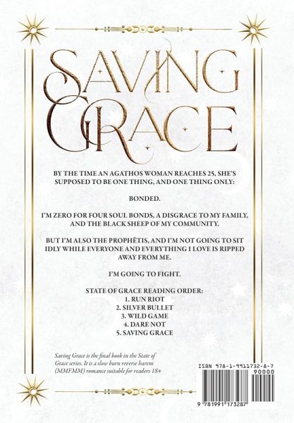 By the time an agathos woman reaches 25, she's supposed to be one thing, and one thing only: Bonded. I'm zero for four soul bonds, a disgrace to my family, and the black sheep of my community. But I'm also the Prophêtis, and I'm not going to sit idly while everyone and everything I love is ripped away from me. I'm going to fight. Saving Grace is the final book in the State of Grace series. It is a slow burn reverse harem (MMFMM) romance suitable for readers 18+ State of Grace reading order: 1. Run Riot 2. Silver Bullet 3. Wild Game 4. Dare Not 5. Saving Grace